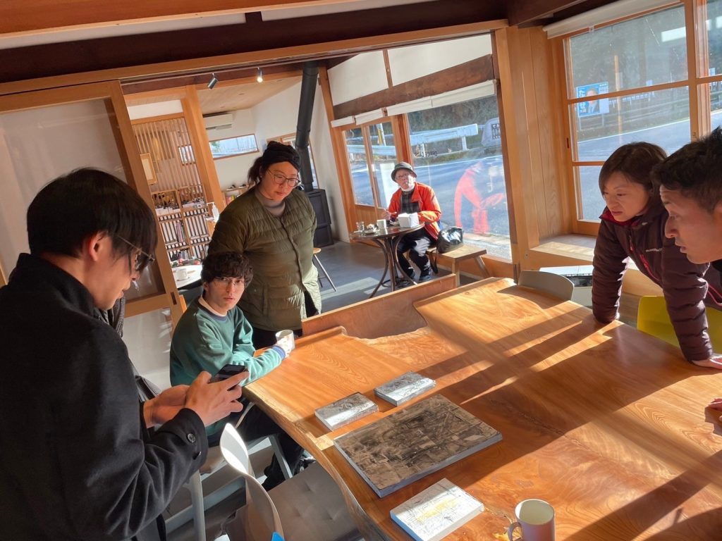 チャレンジショップや地域食堂もされているkameyaや和菓子屋、素麺屋などをぶらりと歩きながら移動していると、突然現るおしゃれな空間「オフィスキャンプ東吉野」へ到着。偶然いらっしゃった村議会議員さんから村のこれまでや現在の状況をお聞きしたり、珈琲を入れて下さった方がアーティストだと教えてもらい、作品を見せてもらう流れからふかーい対話の時間に。