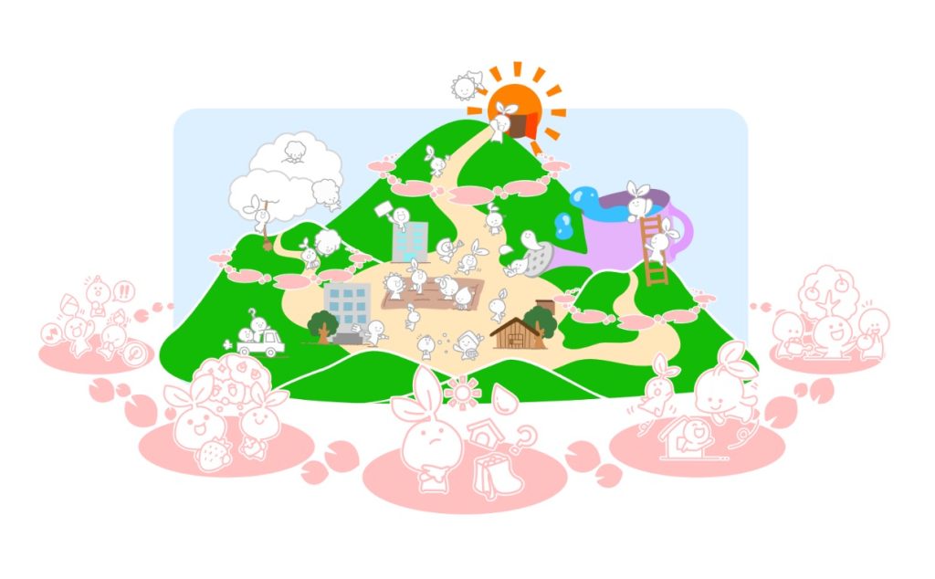 奈良らしい盆地をベースにしています。奈良コミナスの活動も100人いたら100 通り。山の形もいろいろな形にしました。 全員が同じ山の頂上を目指すのではなく、それぞれのペースでそれぞれの山を登ります。山の中腹でコミュニティナーシングを繰り返すのも一つのあり方で すし、頂上に登った後、次の山に挑戦することもあり、「目指すところも人それぞれ」を表現しました。