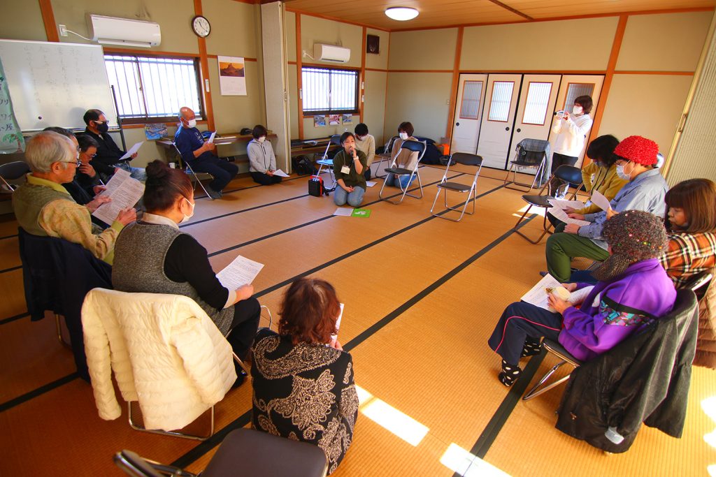 続いては、受講生の専門分野を活かした「がんを防ぐ努力」という内容の講義を実践。体操に参加されている住民の皆さんは、健康維持への意識も高い方で、積極的に耳を傾けて下さり、講義後も多くの質疑応答や相談でにぎやかになりました。住民の皆さんの熱気が高まった後、「地図には載らない『地域の記録』を作るための情報収集をしたい」というテーマでお話。皆さんが次々と「昔は~」と話してくださり、幼い頃の苦労や楽しかった思い出など、たくさんの貴重なお話をお聞きすることが出来ました。