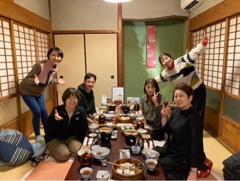 旅館で美味しい夕食を食べたあとは、宿泊先のカフェバーで受講生同士が1日の振り返りをしました。今回はコミュニティナースを目指している受講生や実際に活動を始めている受講生などさまざまでしたが、印象に残っているのは、「今していることがすでにコミナスだと気づいた」でした。ゼミの基本方針でもある、コミナスを“学ぶ”のではなく、すでにみんなの内にある“コミュニティナースマインド”を発露することを受講生が実感できた瞬間でした。